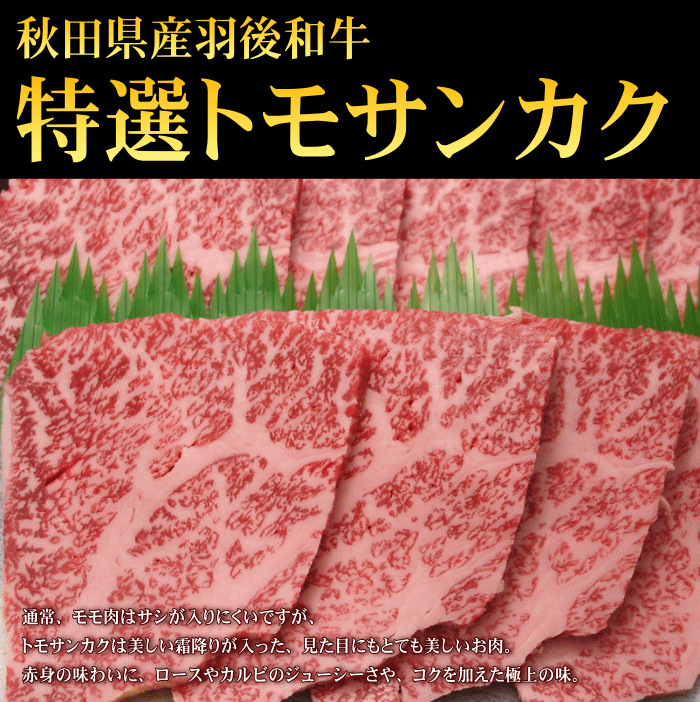 【お肉には放射能検査報告書、子牛登記書、出荷報告書を同梱いたします。安心してお召しあがりくださいませ。】秋田県産羽後和牛の特選霜降りトモサンカクです。赤身の旨さとロースのコクを合わせたトモサンカクを是非。 トモサンカクとは、モモのシンタマと呼ばれる部位のさらに一部のお肉をいいます。通常、モモ肉はサシが入りにくいですが、トモサンカクは美しい霜降りが入った、見た目にもとても美しいお肉です。モモの赤身の味わいに、ロースやカルビのジューシーさや、コクを加えた、たいへんにおいしい部位です。1頭から2キロ程しか取れない稀少な部位です。羽後和牛の極上トモサンカクで豪華な焼肉を♪ お試しサイズに便利な100gパックにいたしました。真空包装してありますので、保存にも便利です。 内容 秋田県産 羽後和牛特選トモサンカク焼肉用一人前(100g) 賞味期限 商品に記載しております。解凍後はお早めにお召し上がりください。 配送方法 冷凍便発送 お願い ※お届けのお肉は写真と異なることがございます。 その時々でサシの入り具合などで違いがございますので、ご了承の上ご注文くださいませ。 お客様都合によるご不在等で生じた商品の劣化につきましては、弊社は責任を負いかねますので、 お届け希望日などの指定には十分お気をつけ下さいませ。