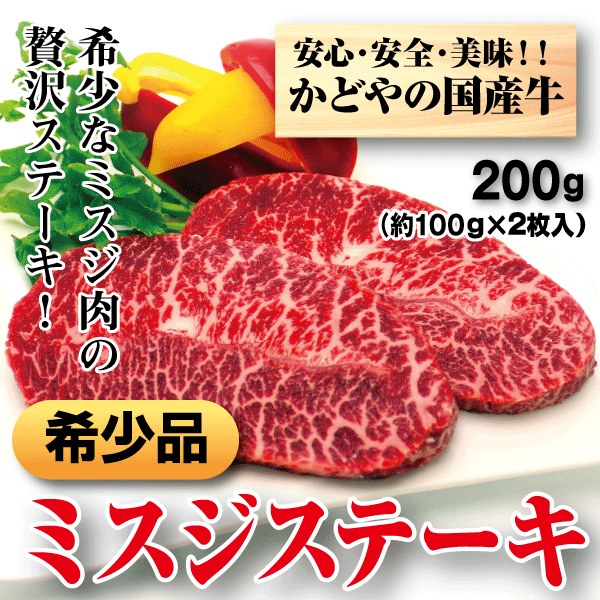 ▼国産牛ミスジステーキ200g▼ 脂身が苦手な方はこちらがオススメ!肩部分の中程の赤身肉です。一頭からとれる量が少なく、肉質が良いため、スーパーなどで目にする事が少ない稀少部位です。美味しく召し上がっていただきたいので、焼き過ぎは厳禁ですよ♪ 名称 国産牛ミスジステーキ 原材料名 国産牛肉、食肉加工用接着剤(酵素)、(原材料の一部に乳を含む) 原産地 国産(複数産地) 内容量 200g(約100g×2枚入) 賞味期限 別途商品ラベルに記載 保存方法 要冷凍(-18℃以下) 製造者 株式会社門屋食肉商事 神奈川県小田原市鬼柳184-4 0465-39-1129 ▼お届けに関して▼ 配送業者 ヤマト運輸 温度帯 クール冷凍便 発送目安 0?1営業日以降、配送希望日に合わせて発送手配致します。 最短での発送をご希望の場合は、「あす楽」もしくは、 配送希望日を指定しないでご注文下さいませ。 時間帯 [午前中][12?14時][14?16時][16?18時][18?20時][20?21時] 上記時間帯からお届け時間帯ご指定いただけます。 ※「あす楽」ご選択時はお届け時間帯の指定が出来ません。